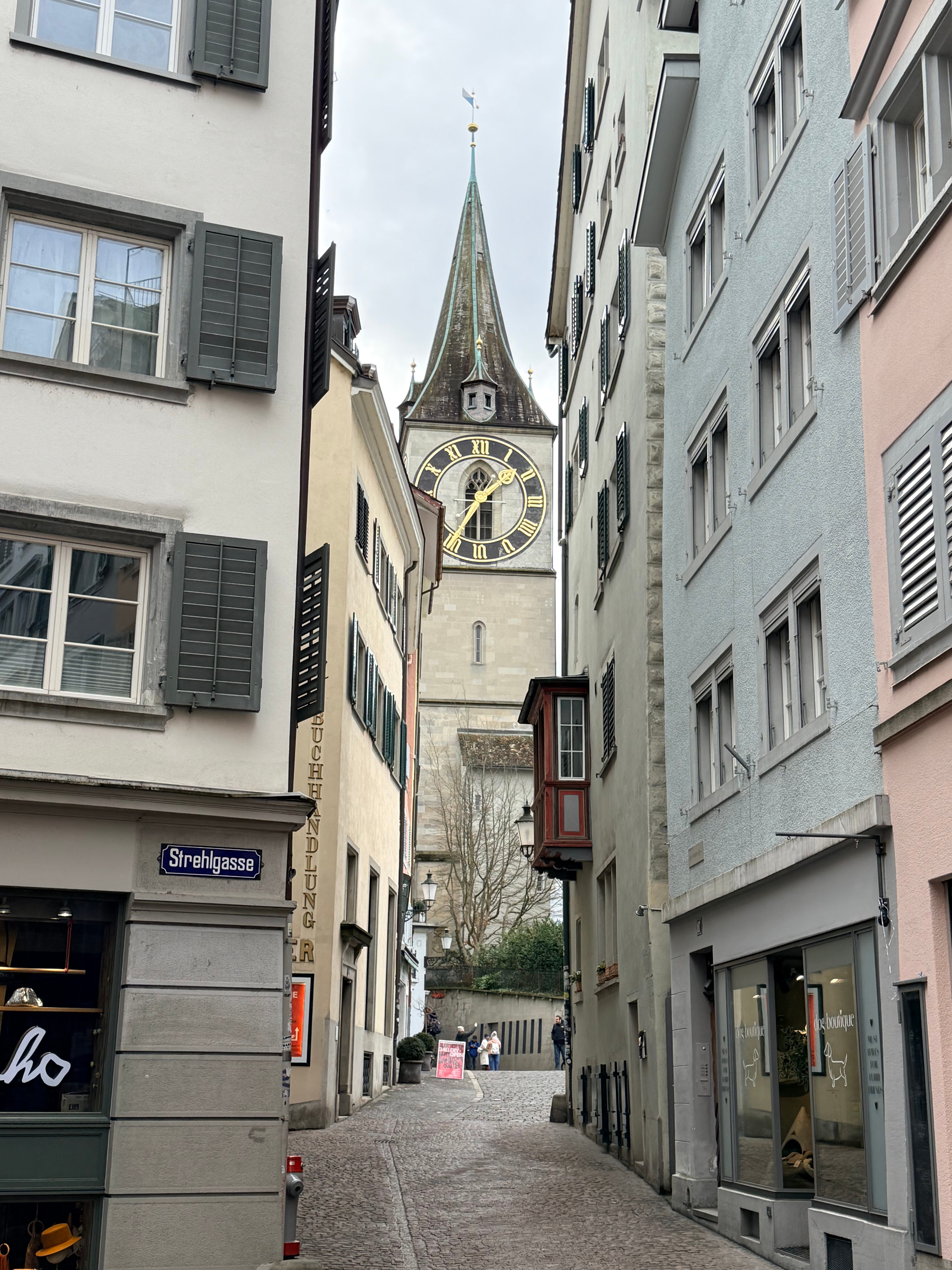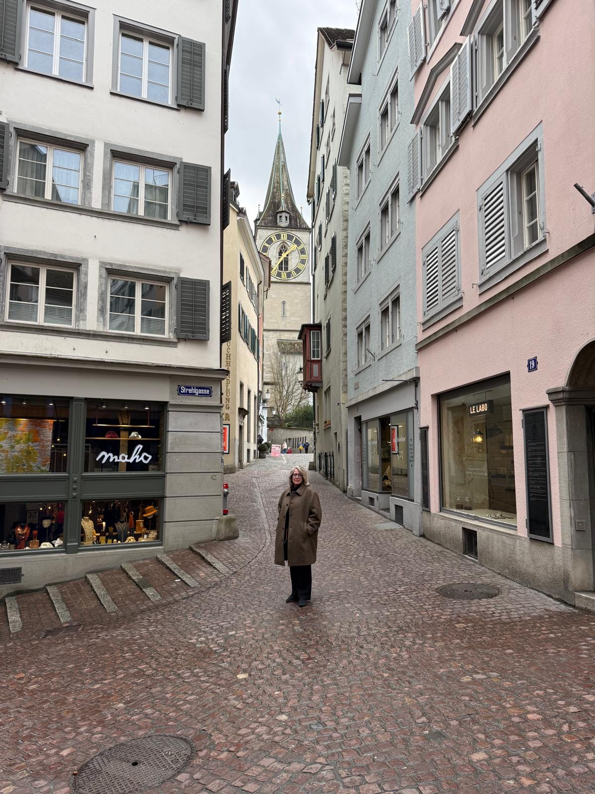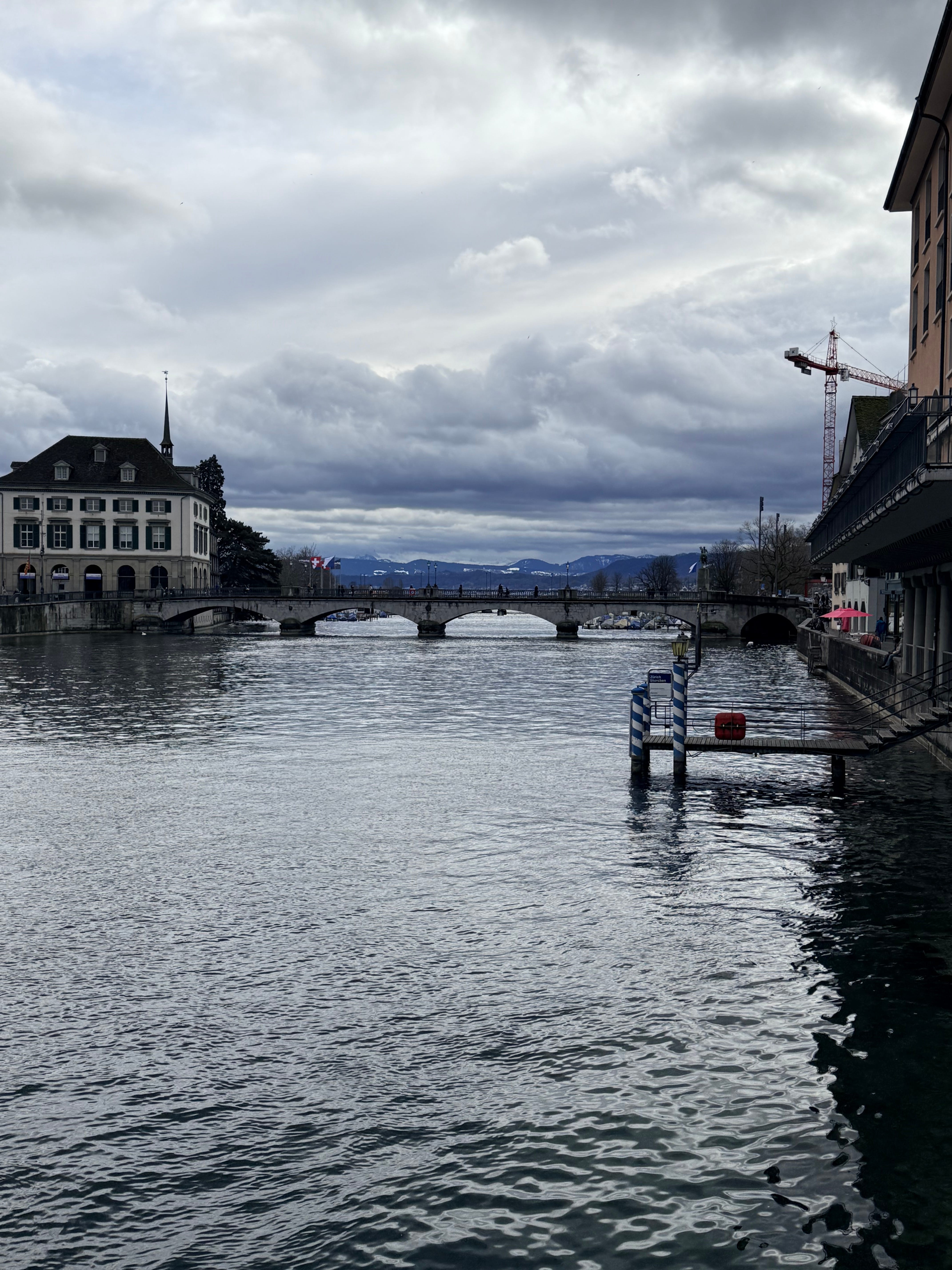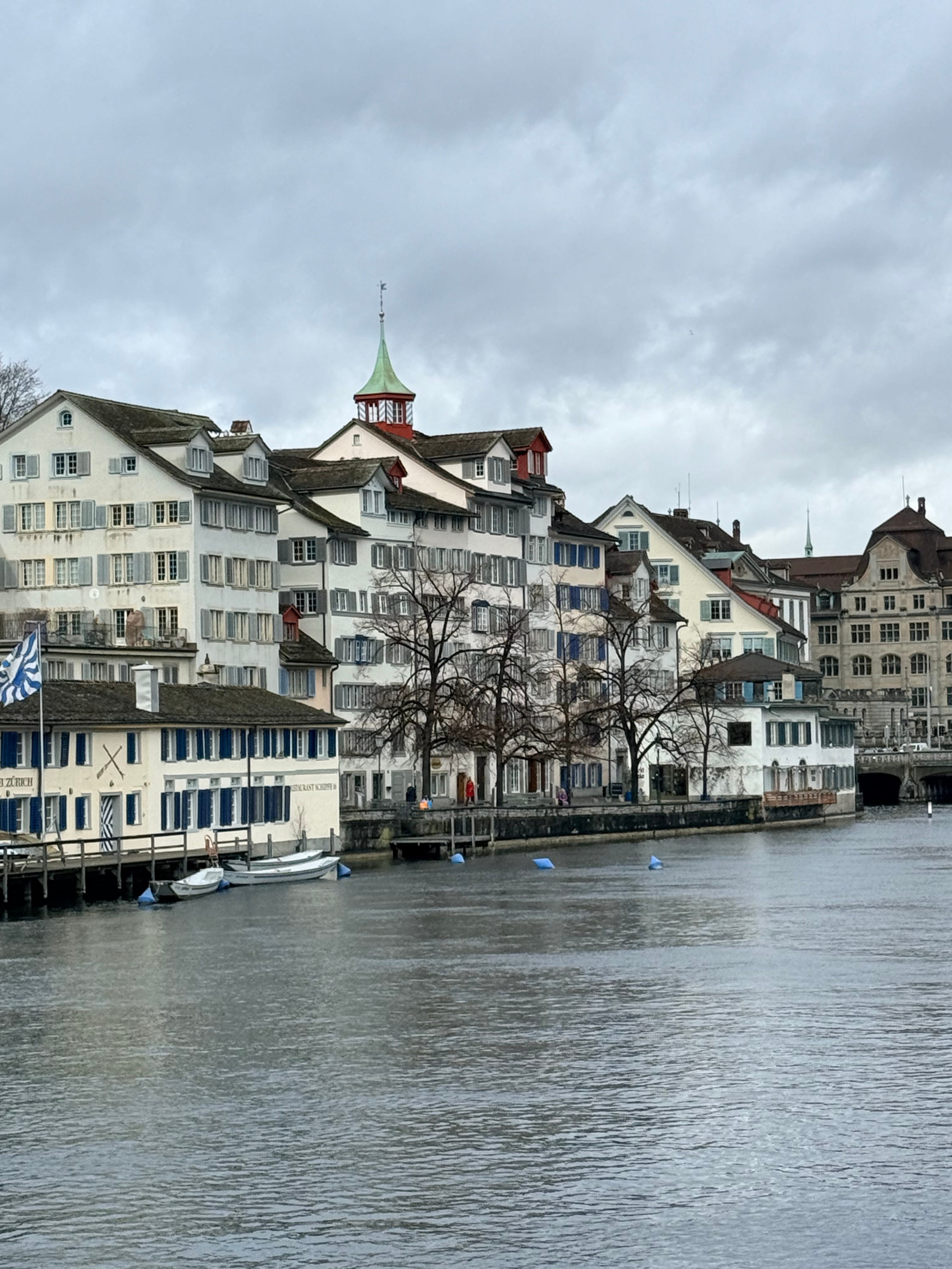 This trip was in the second week of February. I expected it to be cold and thus packed for snow. Yet Zurich was fifty degrees, even though there was a stiff, cold wind blowing down the river. My heavy wool overcoat was just too much.